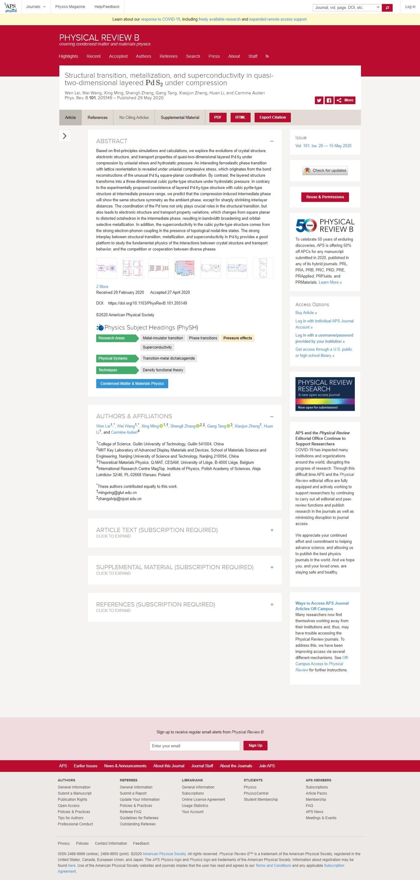 伟德国际1946理学院明星教授团队与南京理工大学张胜利教授、波兰科学院Carmine Autieri博士等人合作,在准二维过渡金属二硫族化合物PdS2材料的高压相变和超导领域取得重要进展,相关研究成果于2020年5月29日发表在国际知名物理学期刊《Physical Review B》上,论文题名为: “Structural transition, metallization and superconductivity in quasi 2D layered PdS2 under compression”。