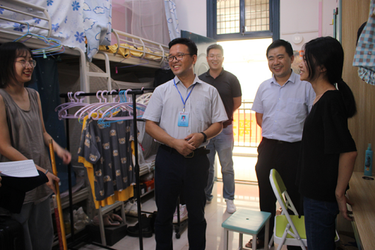 8月28日,为及时了解学生返校情况、学生宿舍卫生、安全状况、意识形态以及学生的精神状态,在2020秋季学期老生开学返校的第一天,我院党委书记欧阳胜权、院长肖剑荣、副书记钟立军、副院长张富文、副院长李明以及年级辅导员走访慰问暑期返校学子以及部分在校研究生。