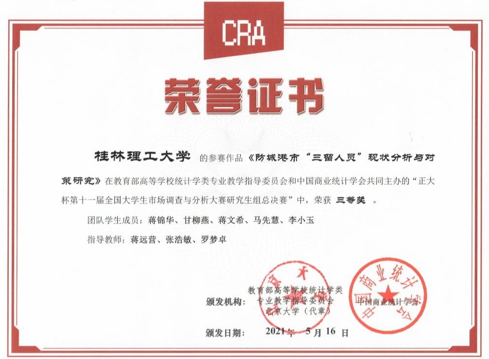 另外,由我院统计学和应用统计专业研究生蒋锦华、甘柳燕、蒋文希、马先慧、李小玉等五位同学组成的团队的作品《防城港市“三留人员”现状分析与对策研究》(指导老师:蒋远营、张浩敏、罗梦卓)荣获研究生组全国总决赛三等奖。