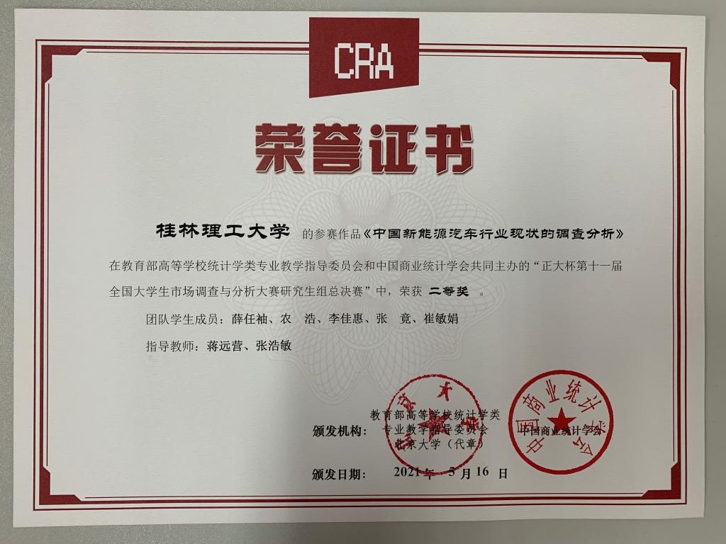 近日,从“正大杯第十一届全国大学生市场调查与分析大赛”组委会获悉,由我院统计学专业研究生薛任袖、农浩、张竟、崔敏娟和李佳惠组成的“Gift团队”凭借作品《“绿”动中国梦,低碳共“净”彩——中国新能源汽车行业现状的调查分析》(指导教师:蒋远营、张浩敏)获得研究生组总决赛全国二等奖。