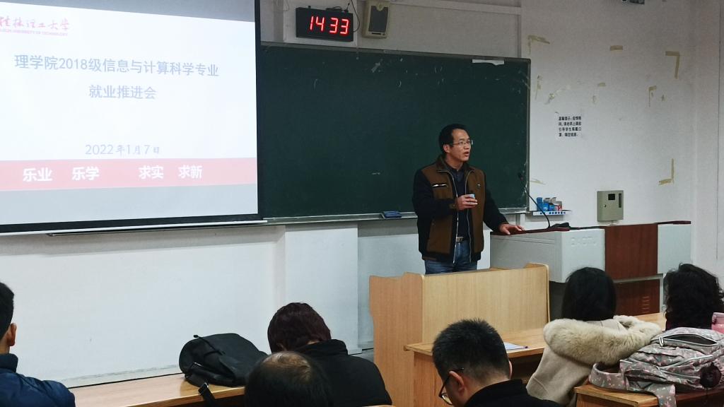 为了更好地贯彻落实学院2021年12月31日召开的2022届毕业生就业工作推进会精神,促进信息与计算科学专业2022届毕业生就业工作,信科教研室1月7日在06308教室举行2022届毕业生就业工作推进会。信科教研室主任谢海老师主持会议。信科教研室全体老师和信科专业2022届全体毕业生参加了会议。