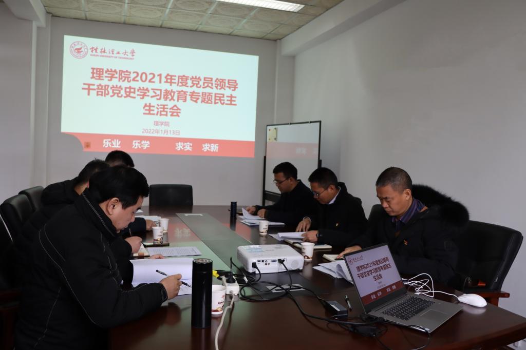 根据桂理工党组〔2021〕22号《关于召开党史学习教育专题民主生活会的通知》,我院于2022年1月13日上午在屏风校区1409会议室召开党员领导干部党史学习教育专题民主生活会。学校学工部(处)部(处)长冯广辉到会指导,会议由党委书记欧阳胜权主持,院长肖剑荣、党委副书记钟立军、副院长蒋远营、副院长李明参加会议,督导组李碧仙列席会议。