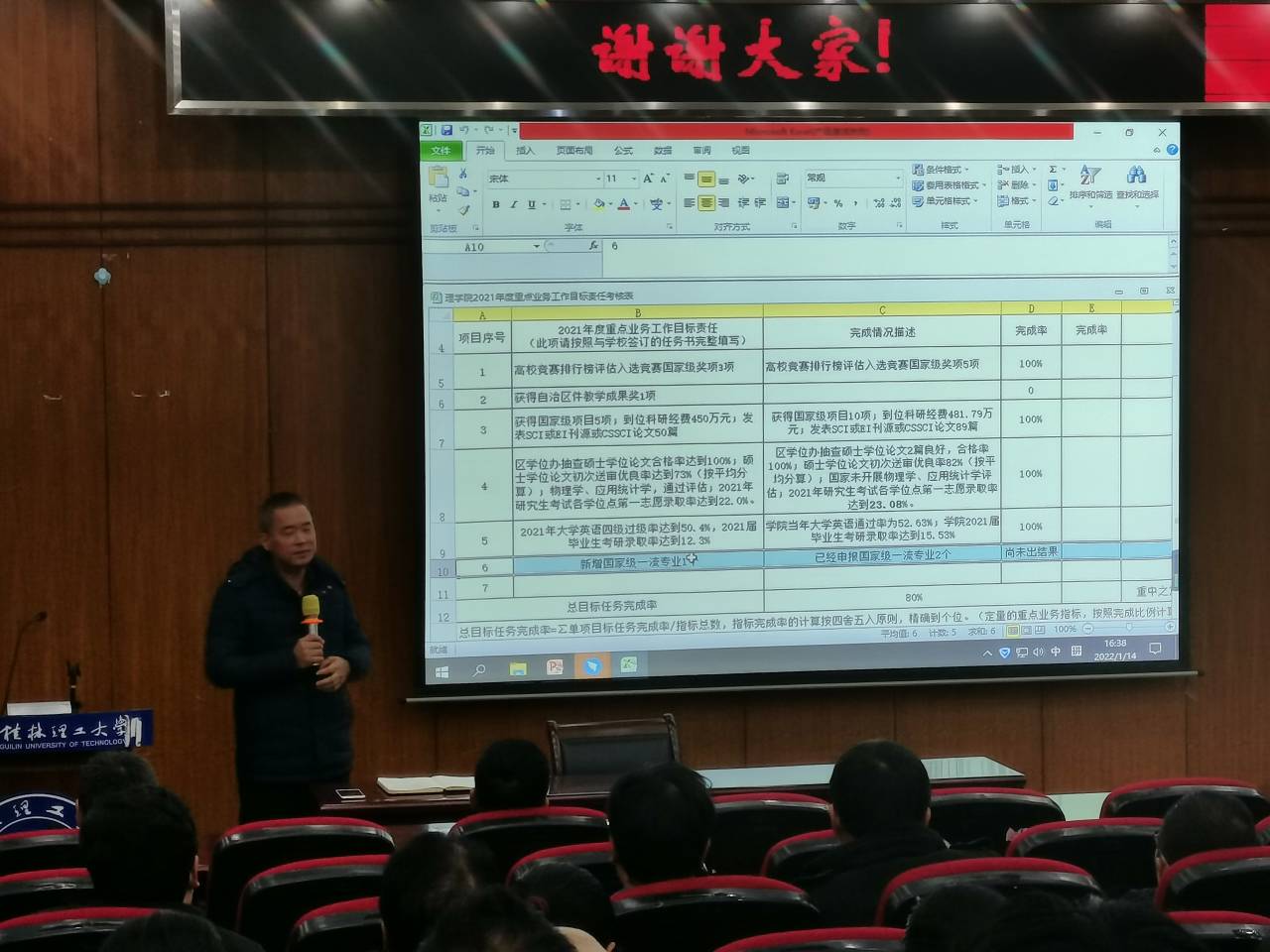 会上,副书记钟立军、副院长李明、张富文、蒋远营分别就各自分管工作进行年度总结并对2022年工作进行了部署。院长肖剑荣就三年聘期期满的考核和新一轮聘岗的开展进行了说明和部署,同时对今年学院的年终绩效分配方案作了详细说明。他还强调:2022年是学院发展关键的一年,全院教职工要齐心协力,在教学和科研工作中再上一个新台阶。