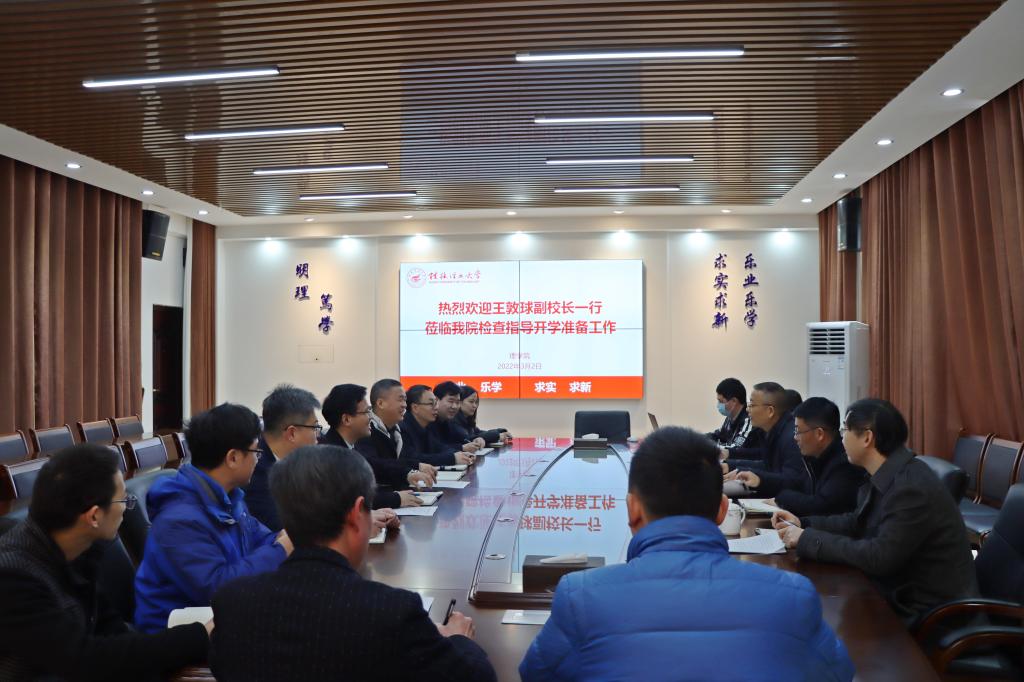 为科学平稳有序推进春季学期开学工作,3月2日上午,学校党委常委、副校长王敦球带领校长助理、人事处处长辛立章,校友办副主任(主持工作)龙媛,发展规划与教学质量监控中心副主任王俊和教务处学籍管理科副科长段炼一行5人到学院检查春季学期开学准备工作,学院党政领导班子和学院中层干部参加了开学检查工作汇报会。
