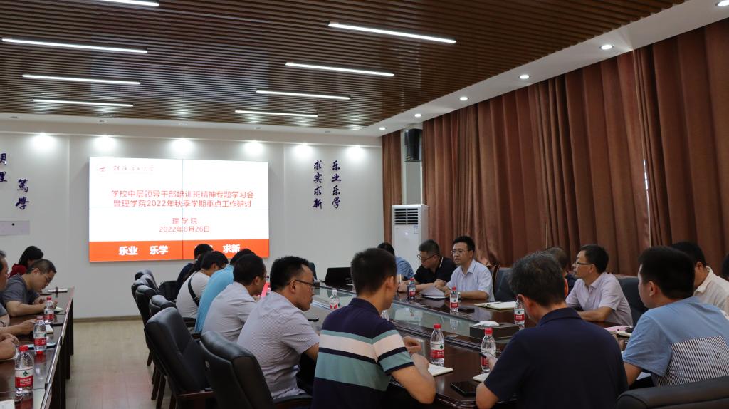 8月26日上午,学院在雁山校区08201会议室召开学校中层领导干部培训班精神专题学习会暨学院2022年秋季学期重点工作研讨会。学院领导班子全体成员、院长助理,办公室主任、各教研室、实验室正副主任以及学工团委负责人参加了会议。会议由欧阳胜权主持。