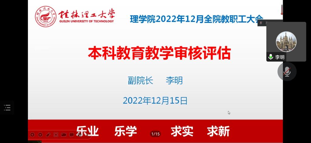 为进一步统一思想和提高认识,2022年12月15日,理学院通过线上会议召开本科教育教学审核评估学习会。本次会议由学院教学副院长李明主持,学院欧阳胜权书记、肖剑荣院长、张富文副院长、蒋远营副院长、钟立军副书记以及全体教师参加了本次会议。