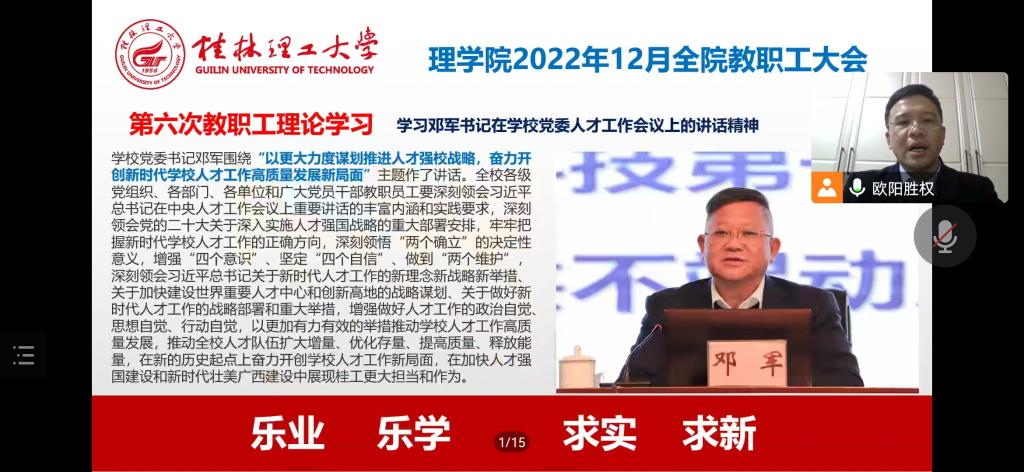 12月15日晚,我院通过腾讯会议平台,在线组织教职工学习学校党委人才工作会议精神,全院教职工参加了会议,会议由学院党委书记欧阳胜权主持。