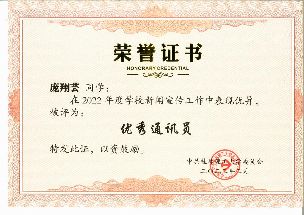 光电2021-1班庞翔芸荣获“优秀通讯员”