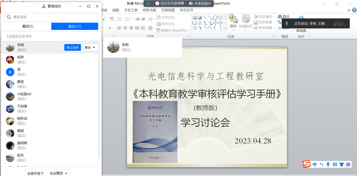 为迎接学校本科教育教学审核评估工作,光电信息科学与工程教研室于4月28日中午组织教研室全体教师开展了《本科教育教学审核评估学习手册》学习讨论会。会议由教研室主任王柳主持。