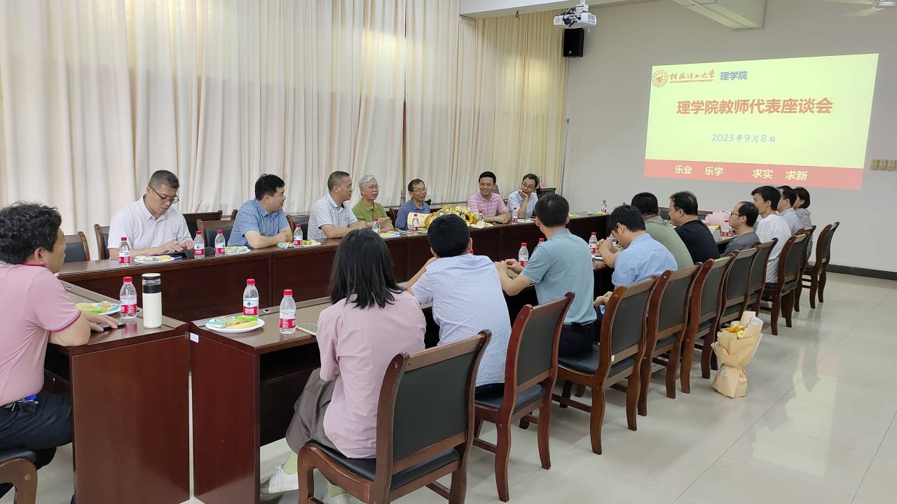 9月8日下午,在第39个教师节来临之际,理学院在屏风校区体育馆附楼一楼离退处会议室召开教师代表座谈会。学院党政领导班子全体成员、各教研室负责人、退休教师代表、2023年国家基金项目获得者以及2023年新进教师参加座谈会。座谈会由学院院长肖剑荣主持。