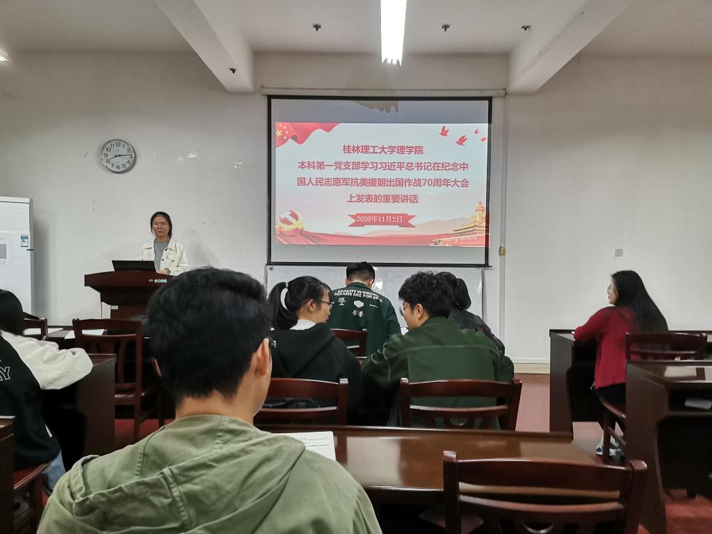 为继承和弘扬伟大抗美援朝精神。 2020年11月2日晚,理学院本科第一党支部在07122开展学习《习近平在纪念中国人民志愿军抗美援朝出国作战70周年大会上的重要讲话》支部大会。大会由支部左右同志主持,支部全体成员参加。
