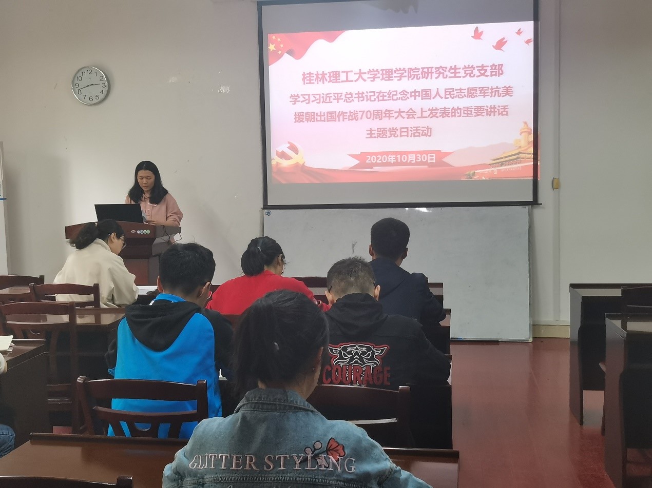 2020年10月30日下午在雁山校区07122教室,我院研究生党支部开展“学习习近平总书记在纪念中国人民志愿军抗美援朝出国作战70周年大会上发表的重要讲话”主题党日活动。会议由支部副书记胡蓉主持,支部全体党员参加。