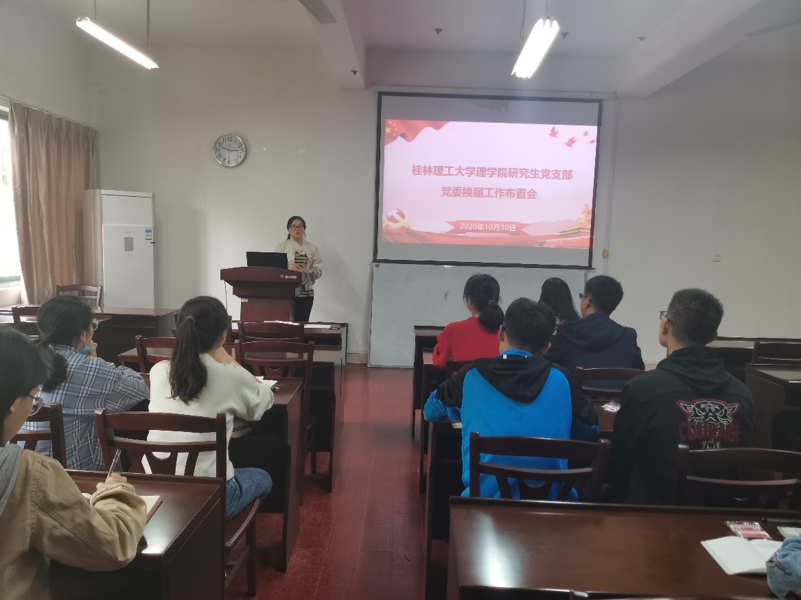 2020年10月30日下午在雁山校区07122教室,我院研究生党支部召开党委换届工作布置会。会议由支部书记梁译匀老师主持,支部全体党员参加。