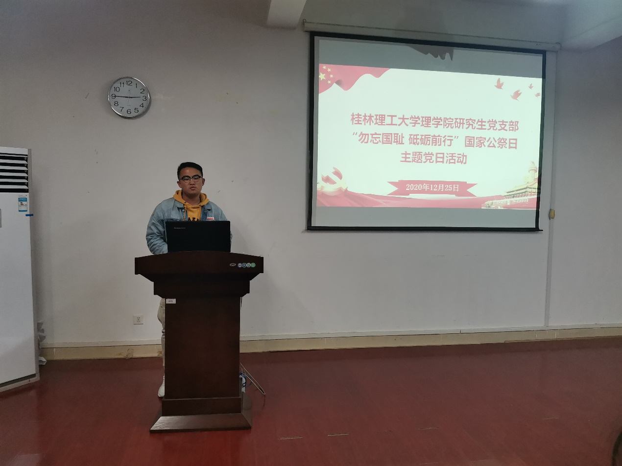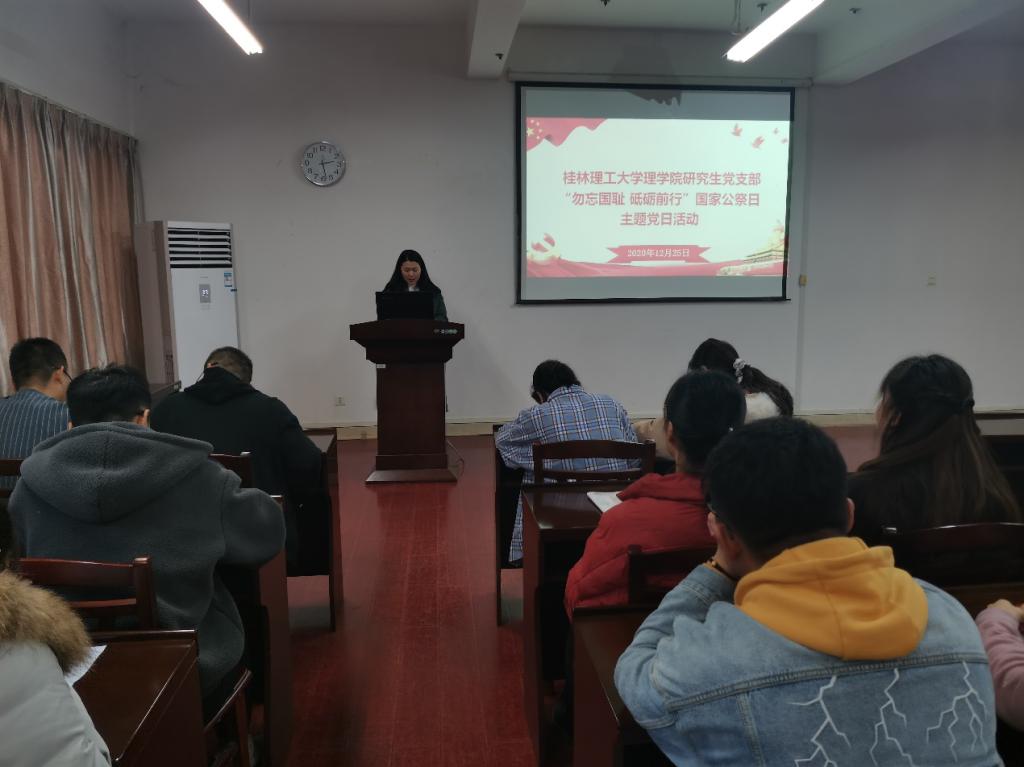 2020年12月25日下午在雁山校区07122教室,我院研究生党支部开展“勿忘国耻,砥砺前行”国家公祭日主题党日活动。活动由支部副书记胡蓉主持,支部全体党员参加。