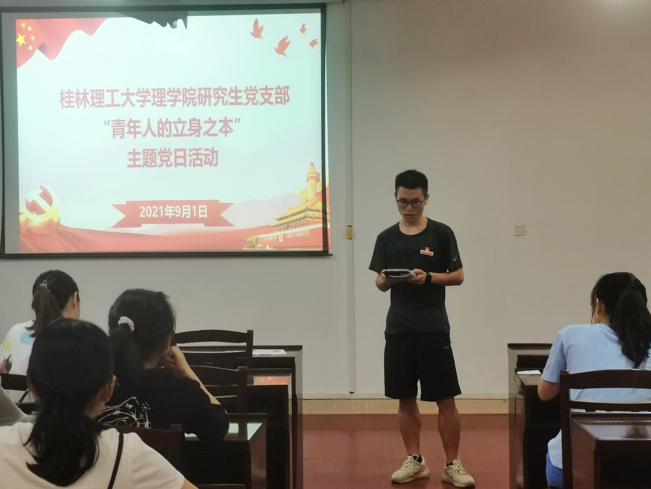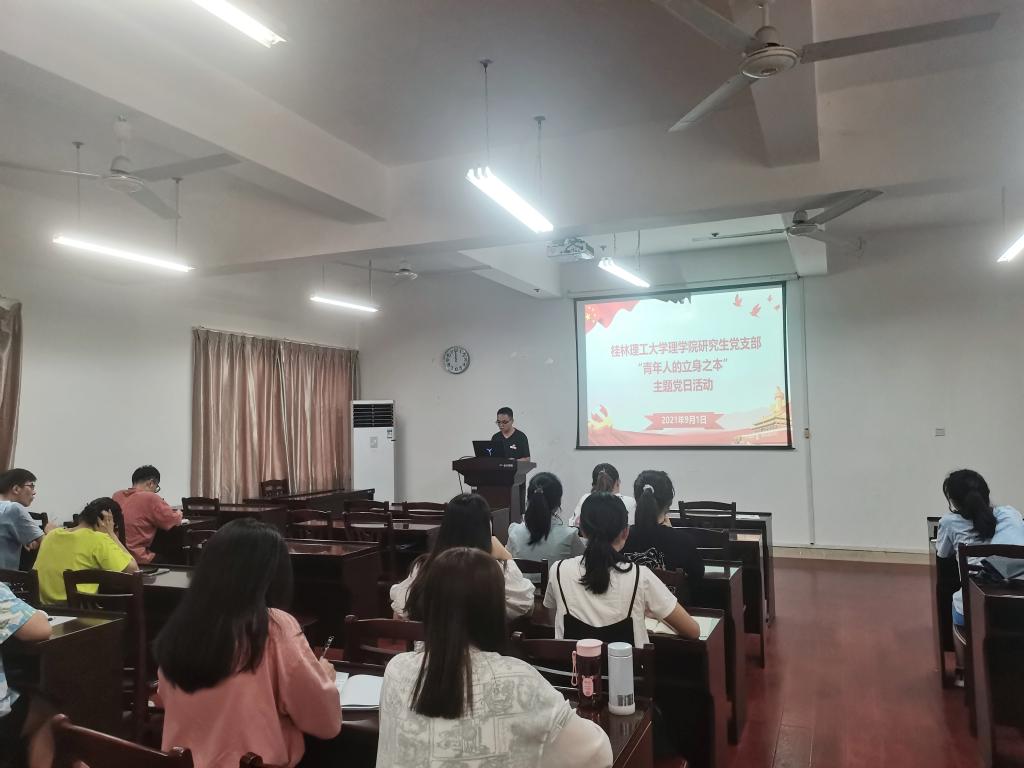 2021年9月1日下午在雁山校区07122教室,我院研究生党支部开展“青年人的立身之本”主题党日,本次活动由支部副书记薛任袖主持,支部全体党员参加。