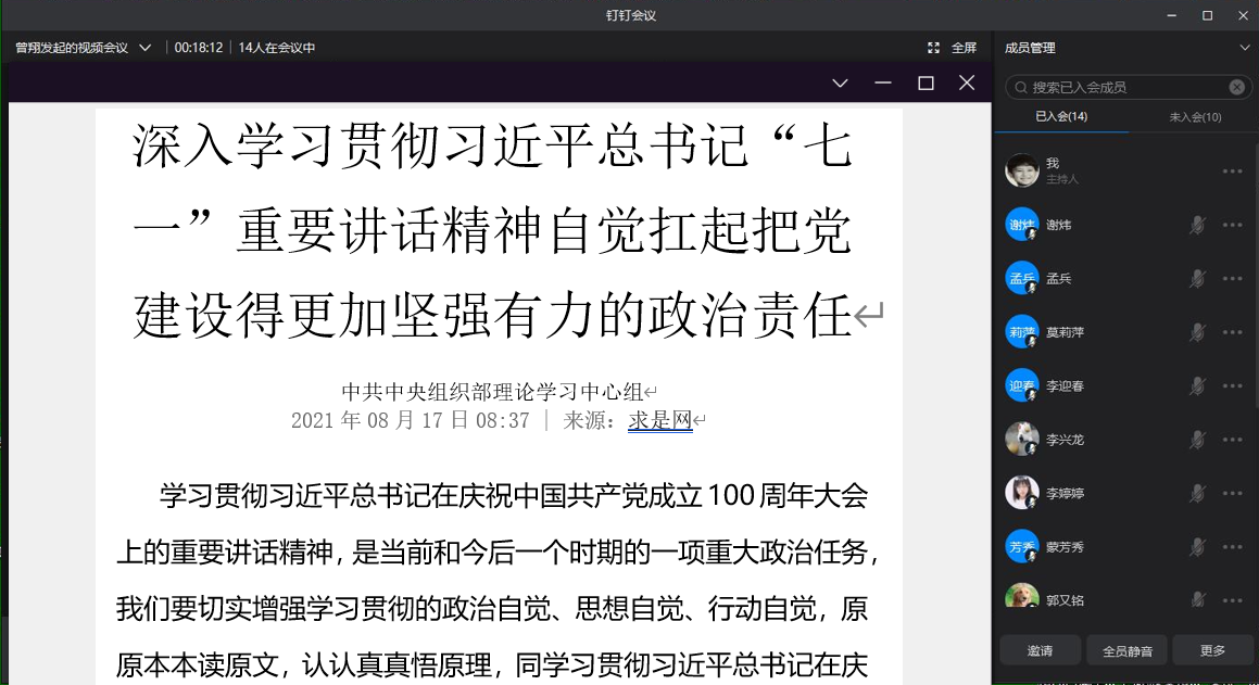 11月9日,教工一支部利用钉钉召开主题党日活动,支部书记曾翔同志带领支部全体党员学习习近平总书记“七一”重要讲话精神。