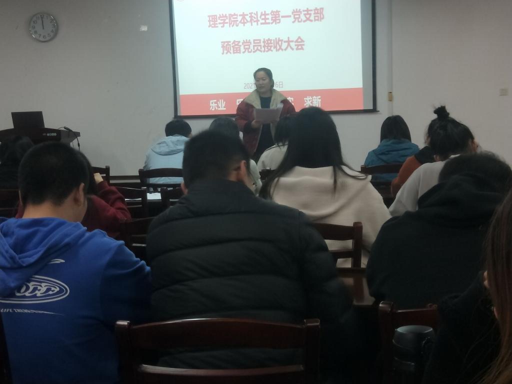 最后,夏晴同志带领全体新接收预备党员同志面向党旗宣读入党誓词,并对本次大会作出总结,她对本次接收的9位预备党员表示了衷心的祝贺,并希望彭静等9位同志再接再厉,做好党员先锋模范作用。新的一批预备党员也表现出了自己高涨的热情和坚定的决心。相信在理学院党委的带领下,他们会变得更加优秀,党支部力量将会更加壮大。