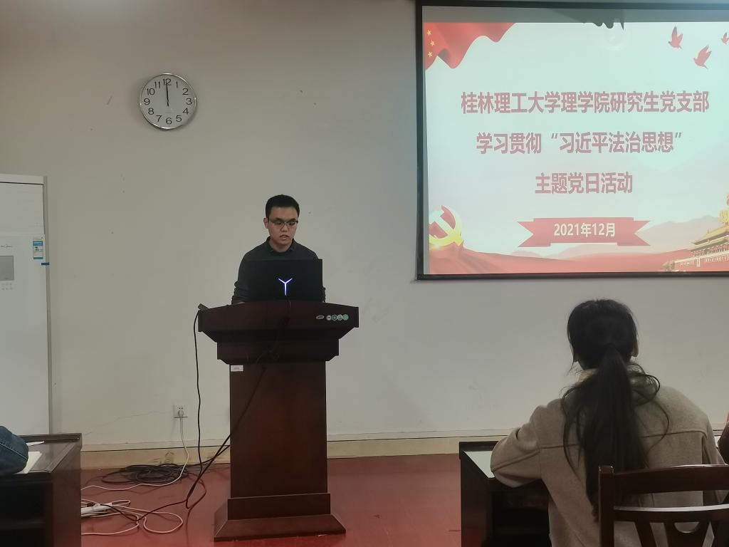 2021年12月24日下午在雁山校区07122教室,我院研究生党支部开展学习贯彻习近平法治思想主题党日活动。活动由支部副书记薛任袖主持,支部全体党员参加。