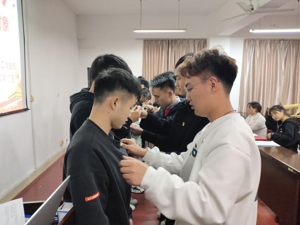 会议伊始,樊梓良等9名党员发展对象逐一宣读《入党志愿书》,并向党组织汇报自身对党的认识、入党动机、个人经历以及在校表现等。随后,由入党介绍人介绍9名拟接收对象有关情况,并对其能否入党表明意见,支部委员会向大会报告发展对象的政治审查情况和征求党内外群众意见的情况,与会党员对发展对象是否符合党员条件充分发表意见。经支部讨论和无记名投票后,支部书记韦长喜老师宣读支部大会决议,同意接收樊梓良等9名同志为中共预备党员。随后支部老党员为新接收为预备党员的同志佩戴党员徽章。