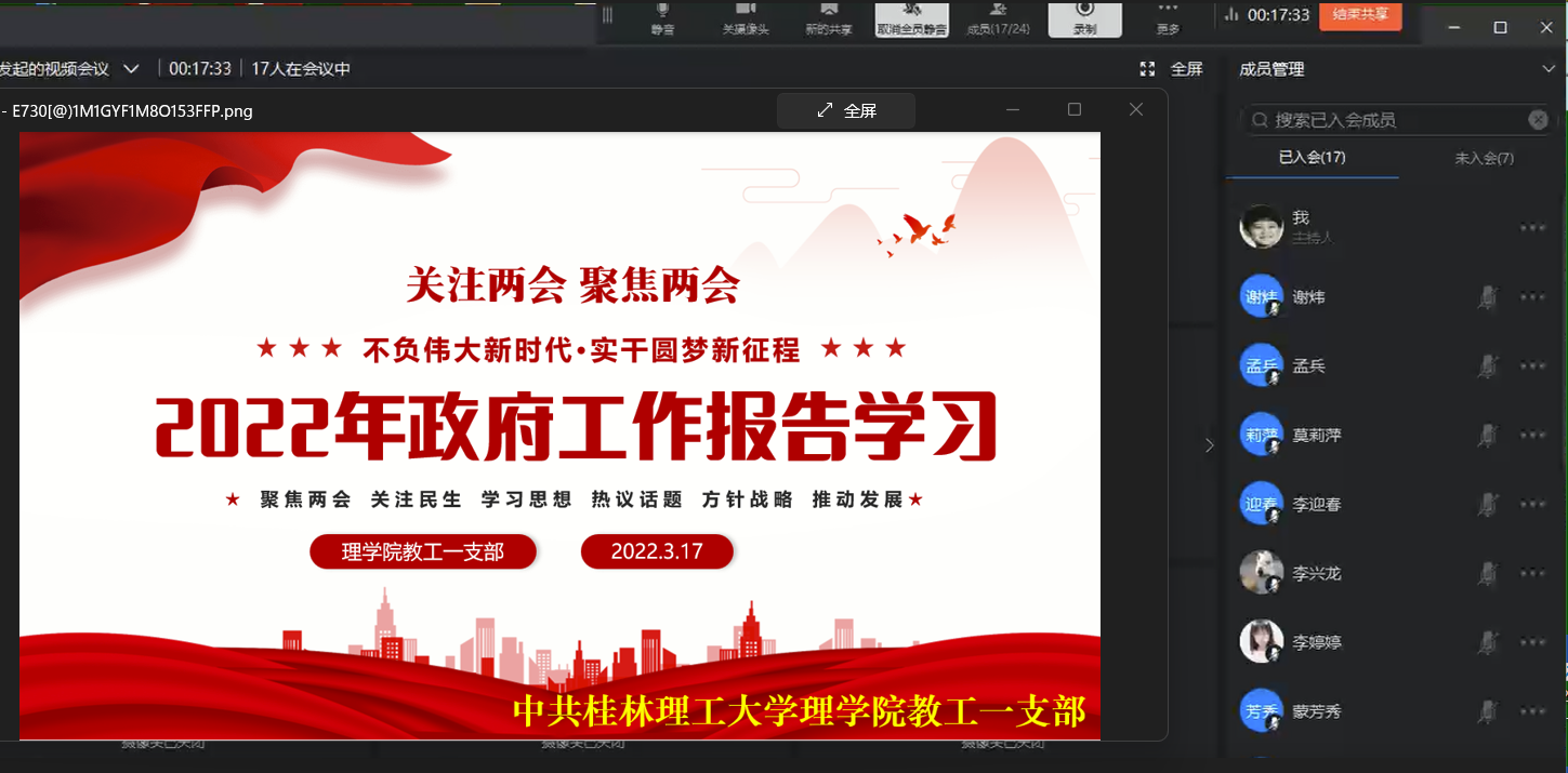 4月24日上午,理学院教工一支部利用钉钉开展线上专题党课学习,支部书记曾翔解读2022年政府工作报告,并学习第一议题:习近平强调这“五个必由之路”,全体支部党员参加学习活动。