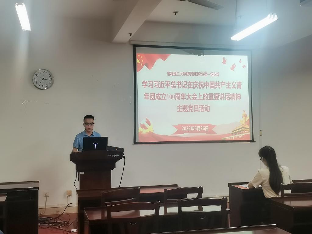 2022年5月26日晚上在雁山校区07122教室,我院研究生第一党支部开展“学习习近平总书记在庆祝中国共产主义青年团成立100周年大会上的重要讲话”主题党日活动。此次活动由支部副书记薛任袖同志主讲,支部全体党员参加学习。