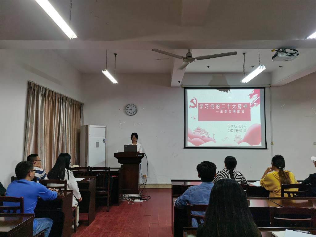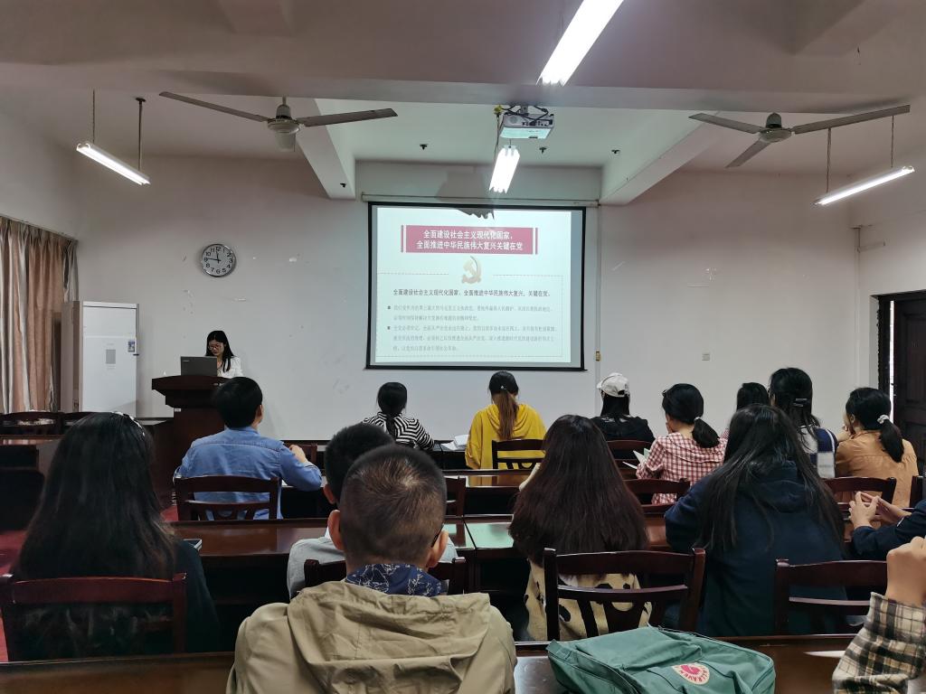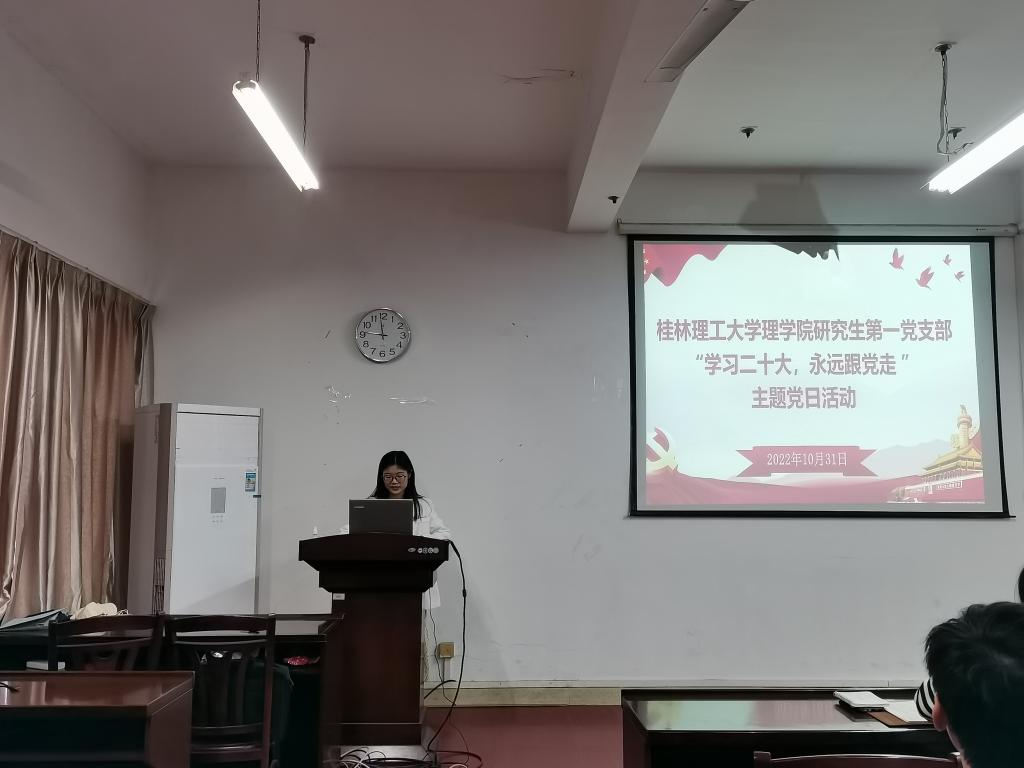 2022年10月31日上午在雁山校区07122教室,我院研究生第一党支部展开“学习二十大,永远跟党走”主题党日活动。此次活动由支部副书记胡倩同志主讲,支部全体党员参加学习。