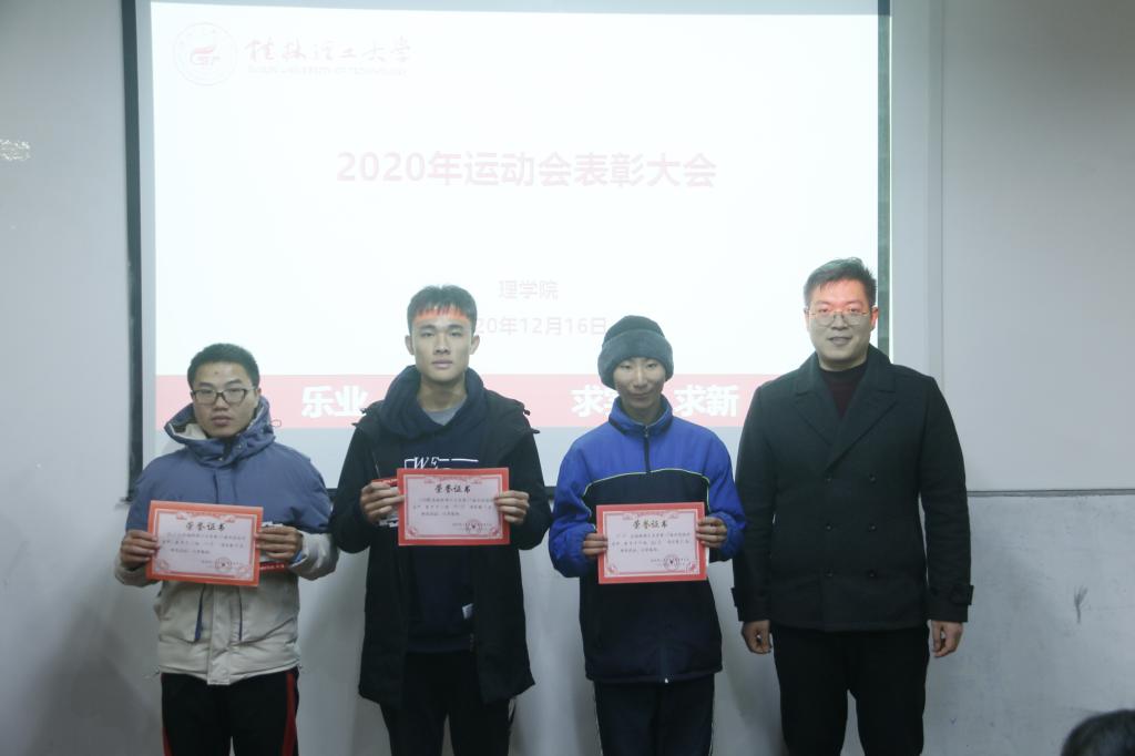 会议伊始,由刘波扬老师、何桂福老师和夏晴老师相继为在校运会中获得“优秀工作人员”,在桂工杯中分别获得第二名、第四名的女篮、男篮团队以及在校运会期间获得个人奖项的同学颁奖。随后,钟副书记为获得男子乙组3000米第一名韩旭东同学、男子甲组跳高第一名杨有幸同学、以及男子甲组1500米与3000米第一名罗仁武同学进行颁奖,并对于在本次校运会上所取得的成绩表示肯定,对所有参赛团队、参赛选手以及在运动会中的所有工作人员表示感谢,他指出同学们应该积极参加体育锻炼,并将优秀的体育精神融入到学习生活中去,争取成为一个“德智体美劳”全面发展的大学生。