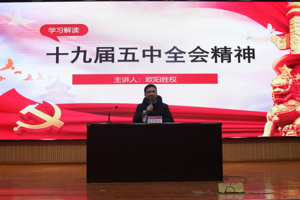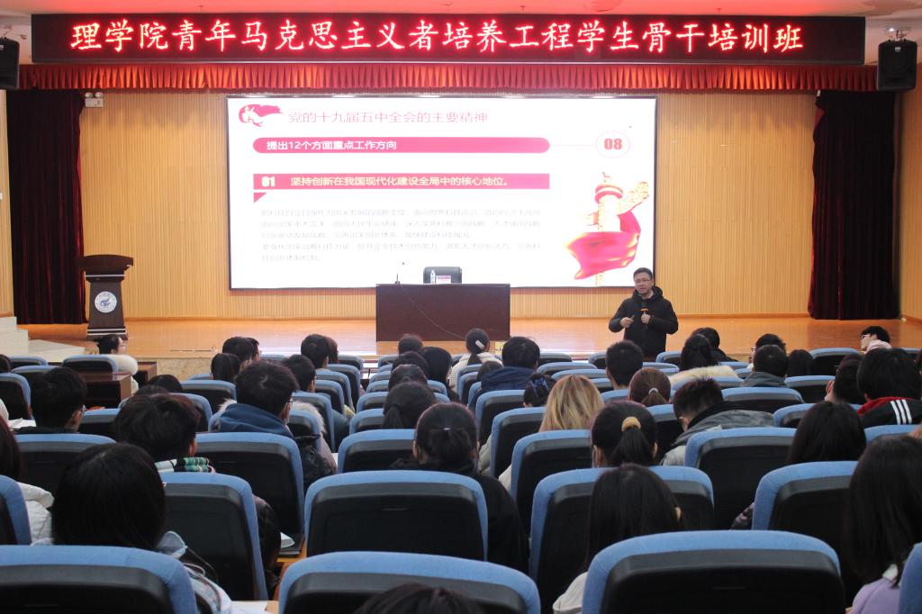 为学习贯彻党的十九届五中全会精神, 1月12日下午,理学院青年马克思主义者培养工程学生骨干培训班第二讲在雁山校区图书馆报告厅开讲,学院党委书记欧阳胜权、辅导员彭娇娇和130余名学生干部参加,本次学习由欧阳书记主讲。