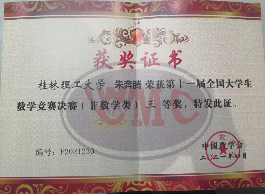 4月18日,由中国数学会举办的第十一届全国大学生数学竞赛成绩揭晓,伟德国际1946理学院光电18-2班的朱奔腾以广西第五名的优异成绩获得全国三等奖。