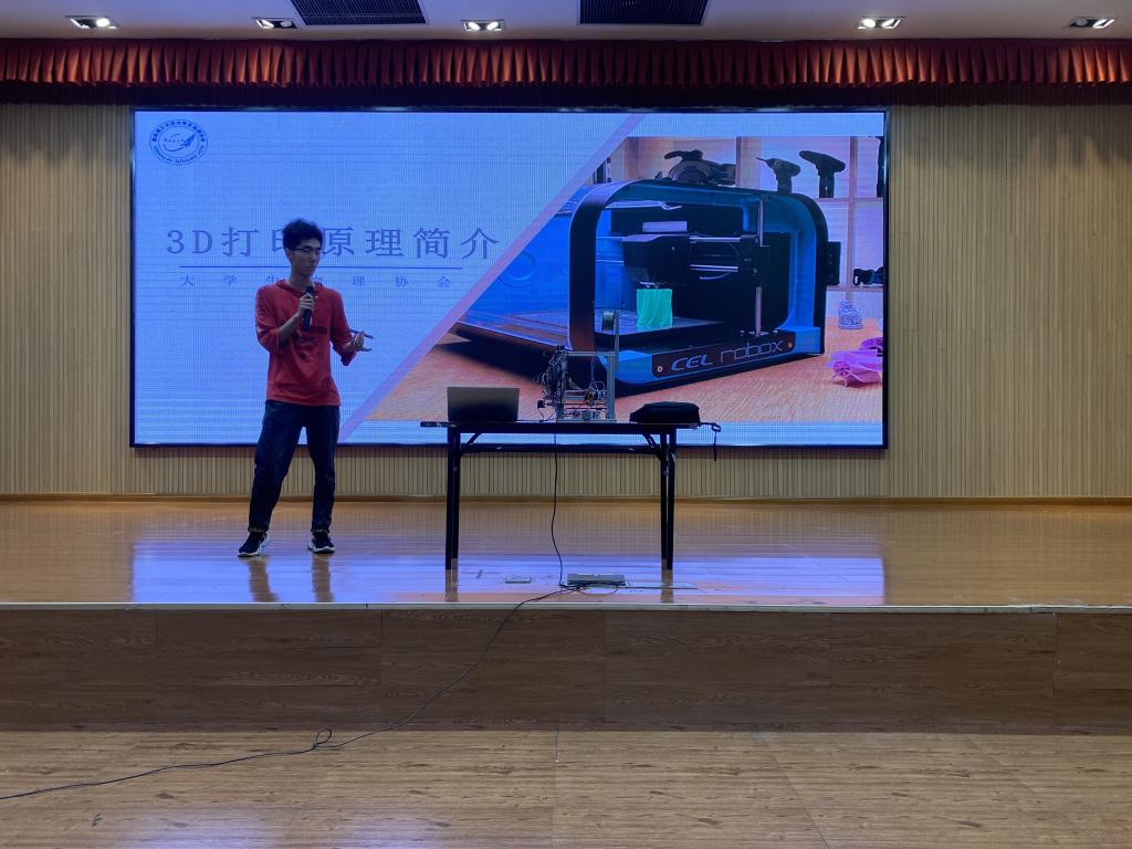 首先,学院党委副书记钟立军为开幕式致辞,钟书记指出理学院最具特色的“数理节”已经走过了它的第十一个年头,回忆过去,硕果累累,展望未来,任重道远,希望对数理感兴趣的同学,可以积极参与到活动中 ,展现自己亮点,辉洒青春,无怨无悔,在我们的活动中有所学、有所悟、有所得,并预祝第十二届“数理节”取得圆满成功。随后,应用物理学2017-1班罗有智同学和统计学2020-1班黄蓉珊同学分享了 “数理”的魅力,勉励同学们传承“数理”魅力,并发扬光大。接下来,为了让大家进一步了解数理节,大屏幕播放了往届数理节活动的视频。物理协会同学通过打印材料、打印方式、产品用途和成品展示四个方面向同学介绍了3D打印技术。最后,由参加本次开幕式的嘉宾老师们上台开启倒计时装置,钟立军老师宣布理学院第十二届“数理节”正式开幕。