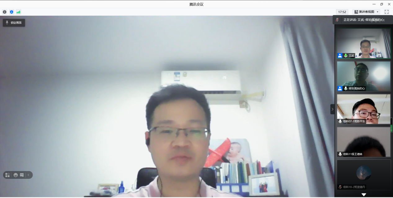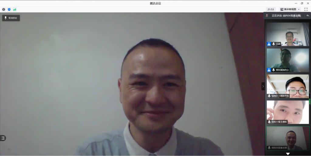 2021年5月28日晚,理学院信息与计算科学就业经验交流会通过腾讯会议召开,会议由信息与计算科学教研室主任艾武主持,班主任封全喜老师、蒋宜蓉老师及专业教研室全体老师出席,活动邀请了秦志刚、陈平东、黄小华、郁雪梅、王德林、邓新宇、龚强、张栋烨8位在就业方面有代表性的学长学姐给同学们分享求职过程和工作的心得体会和宝贵经验。信息与计算科学2018级全体同学,2019级,2020级部分同学参加此次会议。