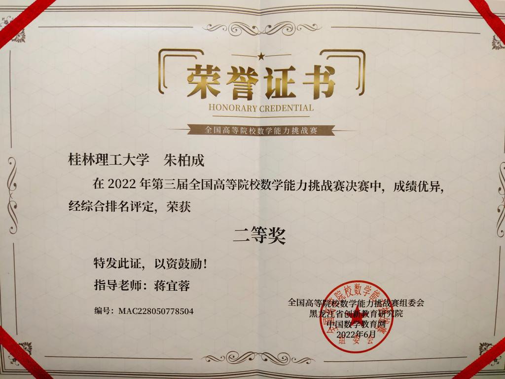 我院学生朱柏成于2022年6月荣获全国高等院校数学能力挑战赛决赛二等奖