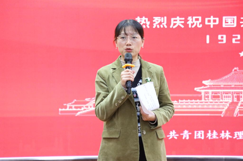 伴随着铿锵有力的《光荣啊,中国共青团》歌声,活动正式拉开帷幕。本次活动主要分为《救国站》和《强国站》两个篇章。在《救国站》篇章,通过观看视频《建党百年历程》、和红色故事《红岩——狱中的五星红旗》了解党的光辉历史。在《强国站》篇章,观看《习近平总书记“七一”重要讲话精神》视频、讲述《支教为笔,助力扶贫,共绘乡村振兴壮美画卷》红色故事、朗诵《请党放心,强国有我》红色诗词、分享学习心得、歌唱《在灿烂阳光下》红色歌曲等多种方式使得在场师生进一步了解党的奋斗历史、感悟党的初心使命。最后,全体师生共同重温入团誓词。校团委副书记莫媛老师为本次示范性团日活动作总结点评。莫老师指出了本次活动的优缺点并强调“本次示范性团日活动是对2021级班长、团支书举办班级团日活动的较好示例,活动内容丰富,形式多样,紧扣主题,各团支部在举办团日活动时要主题鲜明、注重仪式教育、突出思想引领,不断增强青年大学生听党话、感党恩、跟党走的信心和决心”。