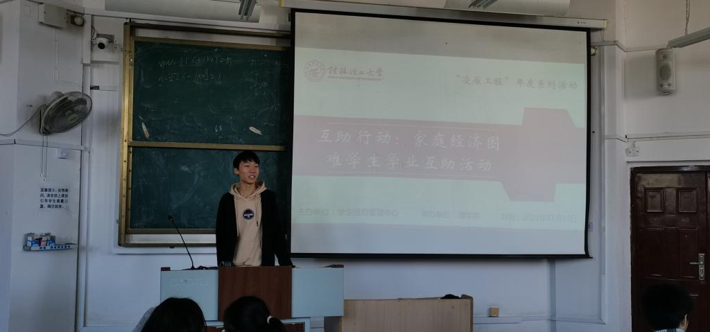 本次活动于中午12:10分正式开始,由受助学生代表上台依次分享探讨学业困惑、学习方法、学习重点和难点以及学习时间分配等问题,同时,也表达了自己对国家资助政策的感谢和以后为国家做贡献的决心。随后,19级樊梓良等5个受助学生也陆续上台分享了各自的专业学习方法、四六级考试技巧以及如何缓解学习压力等等。最后,彭娇娇老师做活动总结,希望多形式多平台开展学业互助活动,发挥好传帮带的作用。