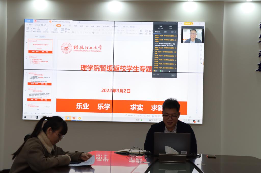 会议伊始,学工组组长夏晴从桂林疾控中心疫情防控举措、返校要求以及相关注意事项进行了逐一讲解和答疑;从科学认识病毒和疫情防控,理解和接纳情绪的变化,掌握一些简单的处理情绪的方法,转移对不良情绪的注意力,通过身体调节改善情绪等方面向学生传授了疫情期间大学生调节情绪的策略与方法,并就学校2022年春季学期心理咨询服务渠道进行了逐一介绍;紧接着向学生强调了居家健康观察期间及时关注网课安排、补考、重修等事项。会议最后,学院党委副书记钟立军从疫情防控、居家心理调试、专业课程学习等方面做了会议总结,并强调了个人是健康第一责任人,居家健康观察期间遇到问题要及时与辅导员多交流、多沟通、多反馈。