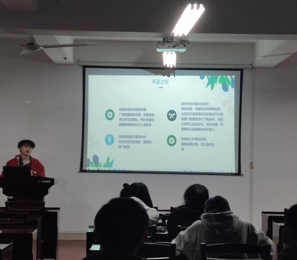 会上,理学院宿舍管理委员会主任团成员侯军杰同学分别从工作开展情况、工作长处以及工作不足三个方面对上学期的工作开展情况进行了汇报总结,就工作开展中存在的不足,他强调,一是要加强组织内部沟通,二是要将工作落实到个人,三是要及时回复通知消息。紧接着,侯军杰同学进行了三月份的工作概述:在明确布置各部门的基本工作任务下不断创新,以发布微信公众号推文为重点拓宽网络阵地,并提出素拓活动的构想概念,推进理学院宿舍管理委员会的工作发展。