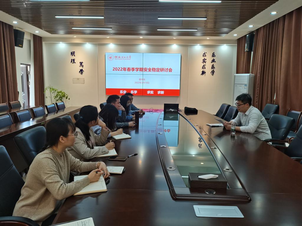 为贯彻落实全区学校疫情防控暨“稳大局保平安攻坚战”校园安全工作电视电话会议精神和驻桂林高等学校和区(市)中职学校疫情防控工作会议要求,坚决防止疫情向校园蔓延,查找封堵疫情防控短板漏洞,2022年3月18日,我院于08201会议室召开了安全稳定工作专题研讨会。会议由学院党委副书记钟立军主持,全体辅导员参加会议。