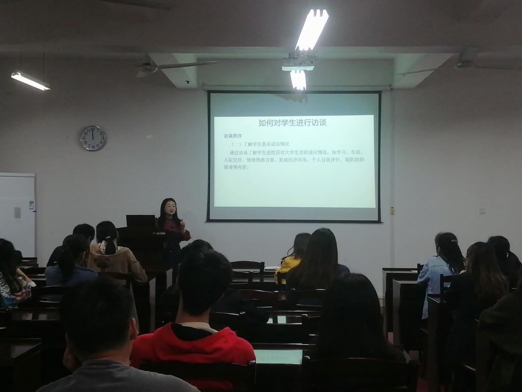 彭娇娇老师就“如何对班级学生开展心理健康访谈”进行培训最后,任冉冉同学对本次会议内容进行了补充:各班心理委员每个月需按时提交《伟德国际1946心理健康信息反馈表》,并认真督促本班同学完成网上心理测试。
