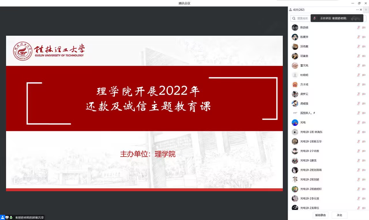 为加强我院受助学生诚信、感恩、励志和成才教育;培养“自尊、自强、自信、自立”的生活态度和正确的世界观、人生观、价值观;树立求真务实、言行一致的诚信形象。2022年12月10日,我院在线上开展2022年还款及诚信主题教育课。理学院全体辅导员、学生参与了本次线上主题教育课。
