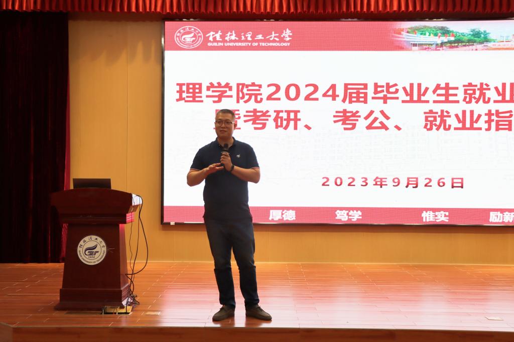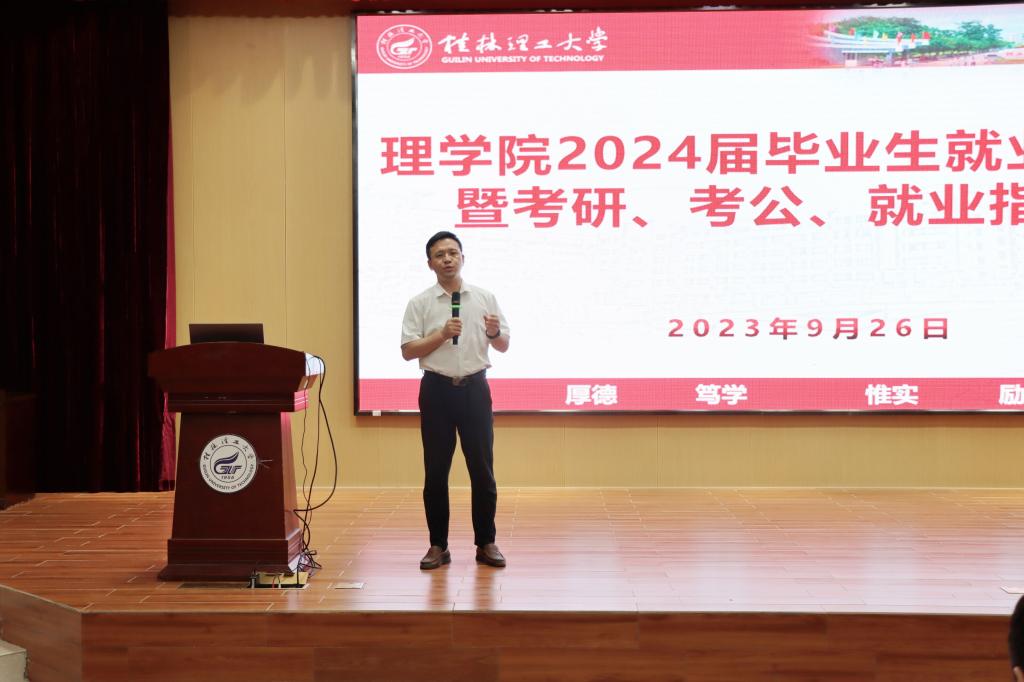 为更好的推进2024届毕业生就业与考研工作,鼓励学生积极就业,树立科学的就业观,增强就业信心,增强考研学子的必胜信心,提高工作的针对性、计划性、前瞻性和实效性。9月26日下午,理学院于雁山校区图书馆报告厅召开了2024届毕业生就业动员大会暨毕业生考研、考公、就业指导会。学院党委书记欧阳胜权、党委副书记钟立军、副院长李明、副院长蒋远营以及各专业教研室主任、各毕业班班主任和年级辅导员出席,2024届毕业生参加了本次会议。