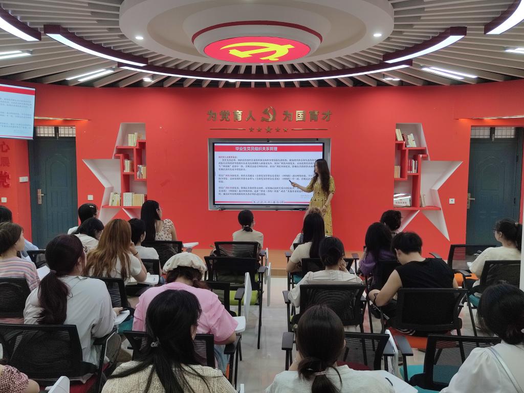 会上,夏晴老师结合《中国共产党党员教育管理工作条例》、学校《关于做好2024届毕业生党员组织关系转接工作的通知》和毕业生党组织关系转接工作相关要求,详细介绍了毕业生党员组织关系转接的工作原则、具体流程、注意事项及转接中可能会遇到的相关问题的处理等内容,并耐心详细地解答了毕业生党员们提出的问题。