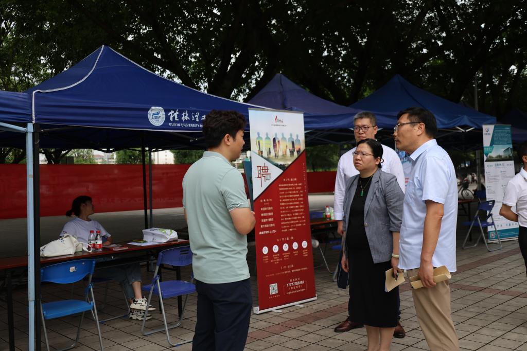 5月17日上午,伟德国际victor·1946源自和外国语学院携手合作,在雁山校区三号食堂广场共同举办2024年春季学期毕业生“百日冲刺”就业专场招聘会。学校学生工作部(处)副部(处)长、大学生就业与职业规划指导中心主任迟国东,伟德国际victor·1946源自党委书记江玲、党委副书记钟立军、副院长唐国强、副院长封全喜,外国语学院党委书记谢济光、党委副书记邓洁琼、副院长李蓉到场指导,各学院毕业生辅导员及2024届毕业生通过线上和线下方式共计500余人参加。