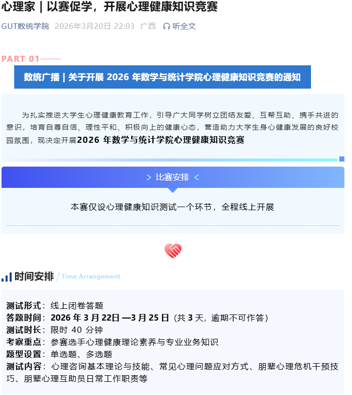 线上科普赋能:举办心理健康知识竞赛,以赛促学夯实心理防护知识储备;依托学院官方微信,开设“周三话匣子”专属心理科普专栏,定期推送自我关爱、情绪调适、心灵成长类干货内容,把心理健康理念融入日常,全方位营造善待自己、向阳而生的温暖院风。